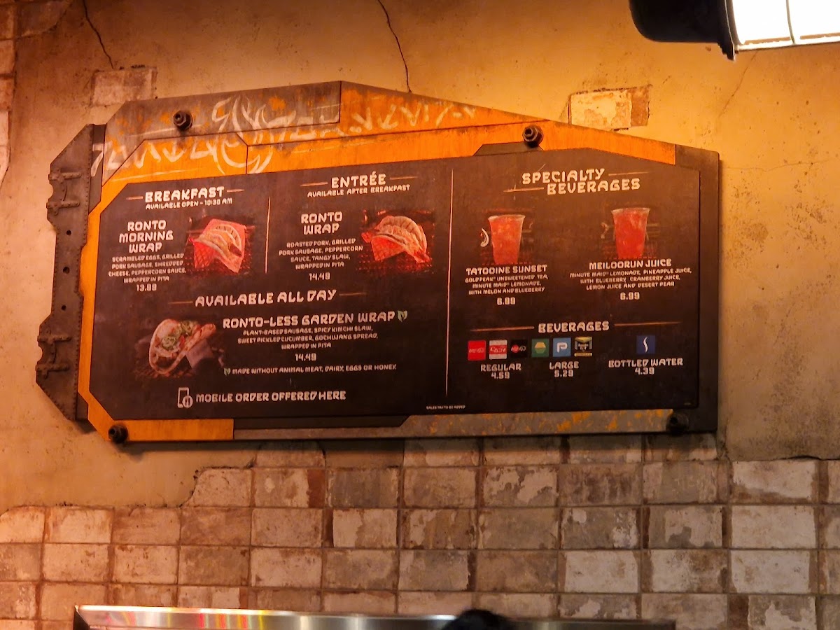 “ In Disneyland's Galaxy's Edge, Ronto Roasters offers delicious pork sausage and plant-based wraps daily. The breakfast menu is available from the park's opening to 10 a.m. The Ronto Wrap includes grilled pork sausage, fresh slaw, and peppercorn sauce wrapped in soft, warm pita bread. The flavors are great, and the sausage link has a perfect snap when bitten. The breakfast Morning Wrap didn't disappoint. It's one of the best breakfast items in Disneyland, in my opinion. It has pork sausage, fluffy scrambled eggs, cheese, and creamy peppercorn sauce. I wish there were bacon pieces or strips to kick it up a notch. The recently added Pijali Wrap (which might be seasonal) is another delicious lunch or dinner option. If you like pesto and Italian meats, this wrap might suit you. It comes cold like a deli sandwich but in pita bread. You can also purchase refreshing specialty and standard drinks here. My recent order was the Tatooine Sunset, an unsweetened tea and lemonade mix with melon and blueberry. Overall, Ronto Roasters offers some of my favorite eats in Disneyland. Magic Key pass holder discounts and mobile ordering through the app are available. Tables and seating are available around Galaxy's Edge. ”